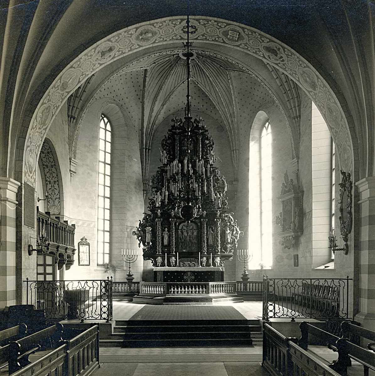 Interiör från Heliga Trefaldighetskyrkan i Gävle. Text baksida kort: "Heliga Trefaldighets kyrka i Gäfle. Tillhör Ivar Hultin, Gäfle".