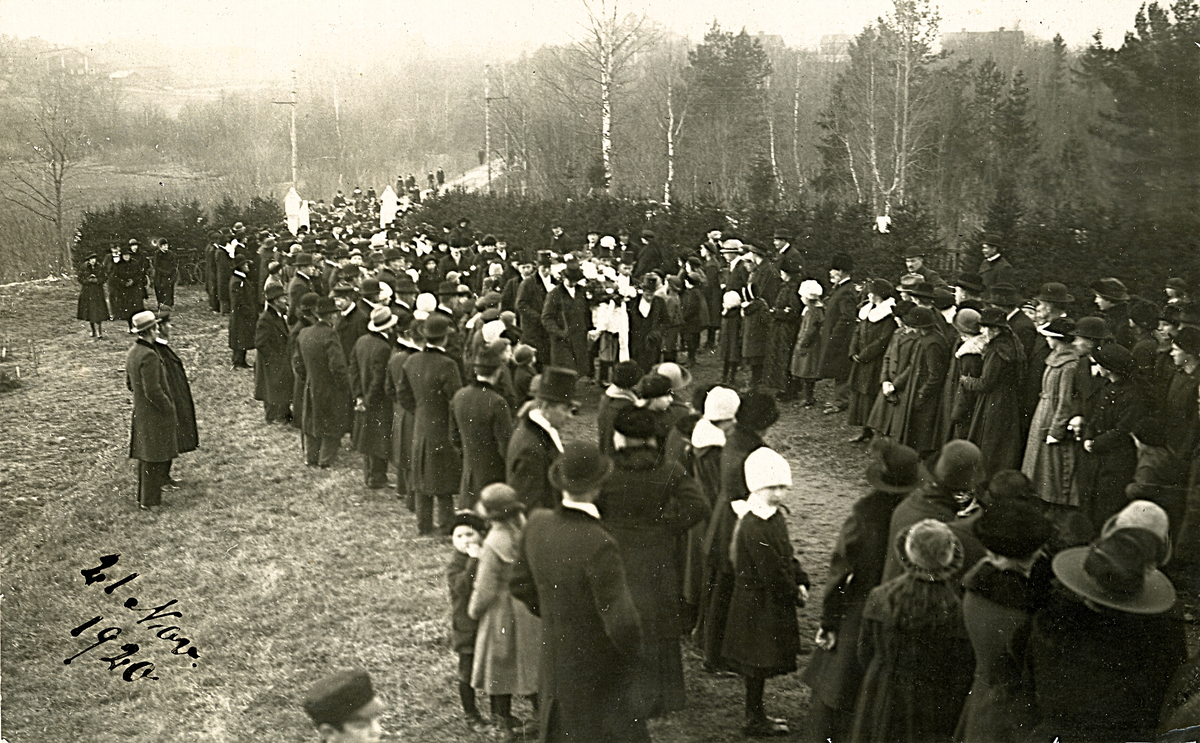 Folksamling vid en begravning. Text baksida kort: "Begravningen å Bomhus kyrkogård d. 21/11 - 1920 då den mördade Elin Mattsson fördes till den sista vilan".