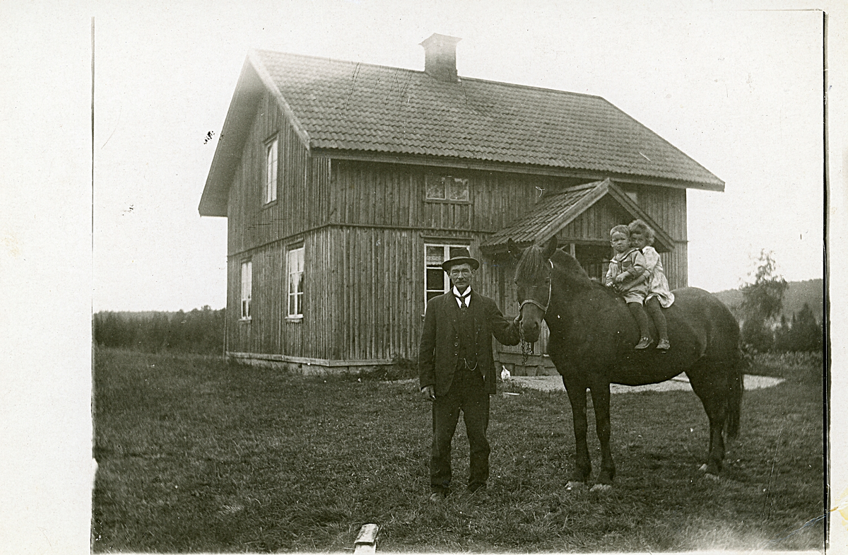 Titel: En man med hatt som håller i tyglarna till en häst. Två små barn sitter på hästens rygg. I bakgrunden syns ett hus. Text baksida kort: "Farbror Otto, Elsa och Kaia?".