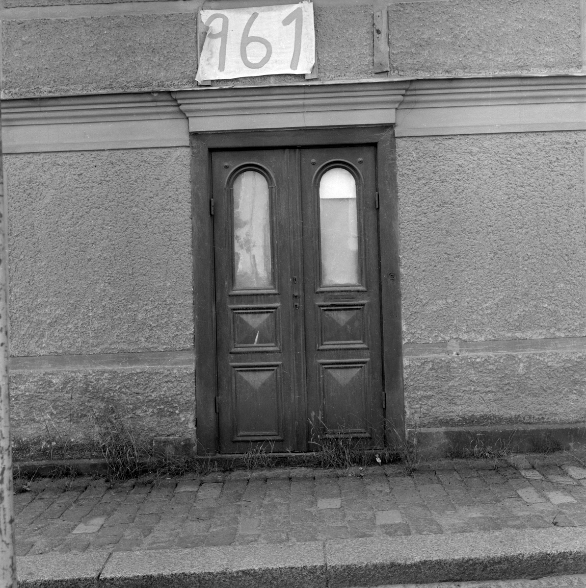Bild ur Östergötlands museums serie dokumentationer av fastigheten Nygatan 50 i Linköping inför rivning 1961. Porten mot gatan, där anslaget "961" inte låter sig förklaras. Möjligtvis och av någon anledning rivningsåret "1961".