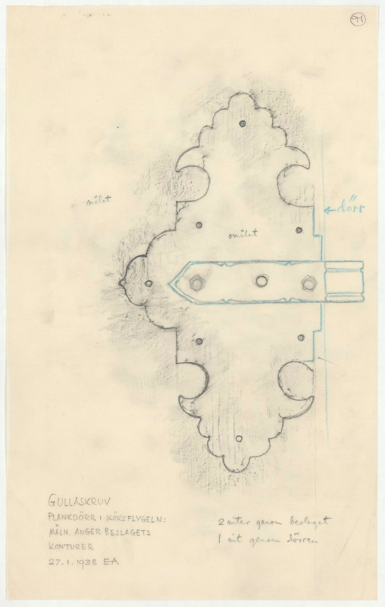 PLANKDÖRR I KÖKSFLYGELN. MÅLNING ANGER BESLAGETS KONTURER.
