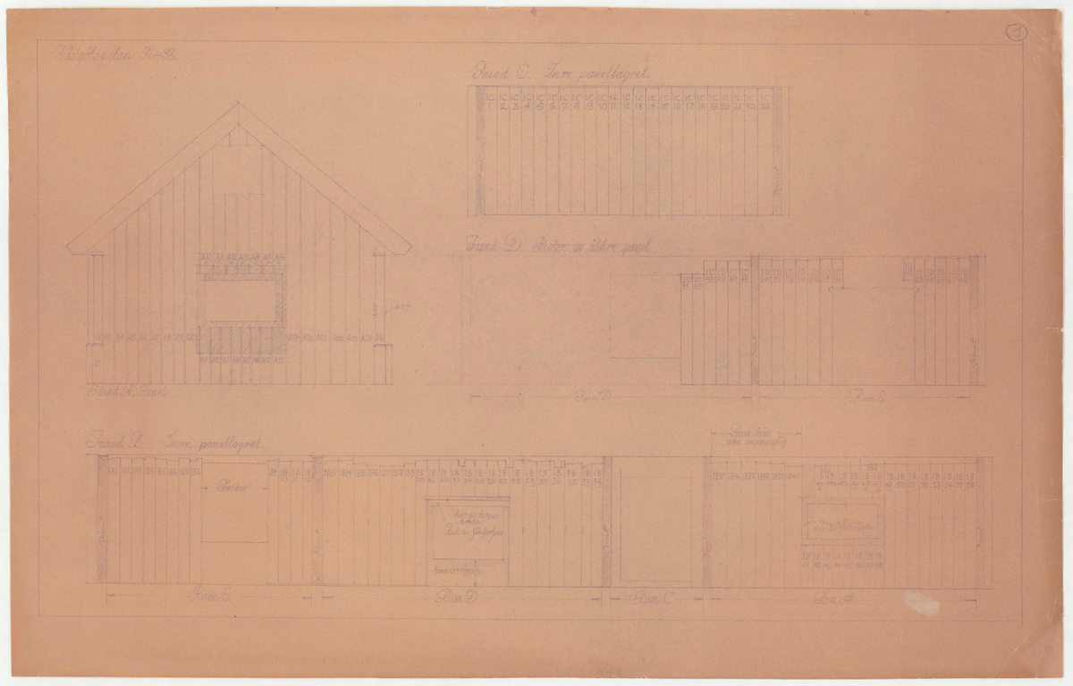 Titel: Skomakarverkstaden. Fasadritning. Panel.