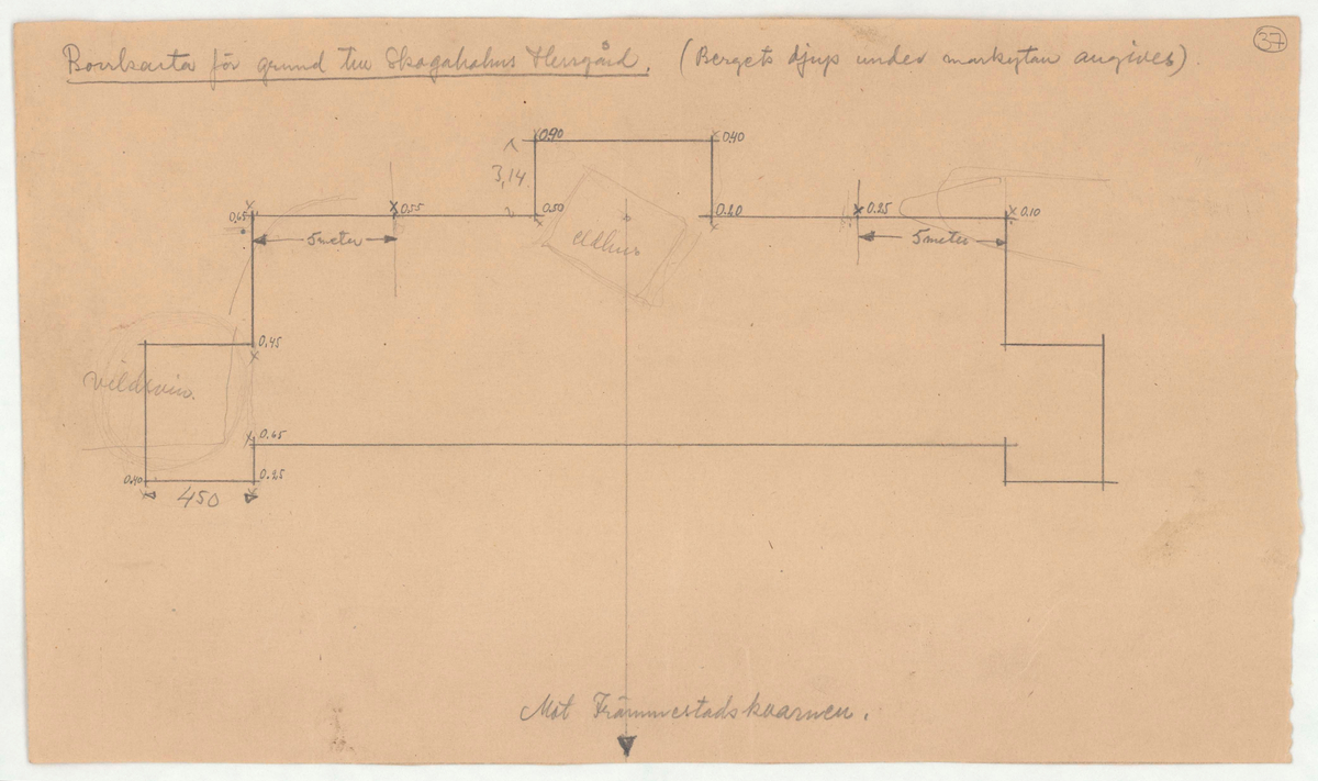 Borrkarta för grund till Skogaholms herrgård (bergets djup under markytan angives).