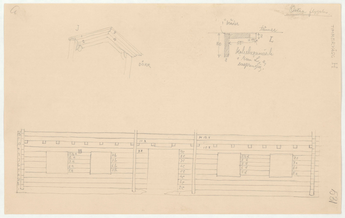 Titel: Skogaholms herrgård. Köksflygeln. Detaljritning. Östra flygeln. TIMMERVÄGG H.