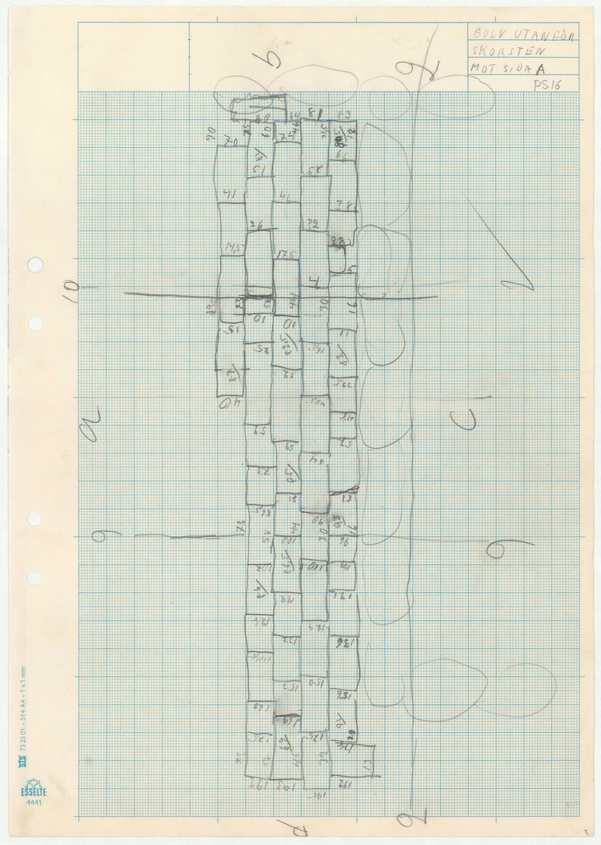Titel: Skånegården. Bostadshuset. Detaljritning GOLV UTANFÖR SKORSTEN MOT SIDA A.