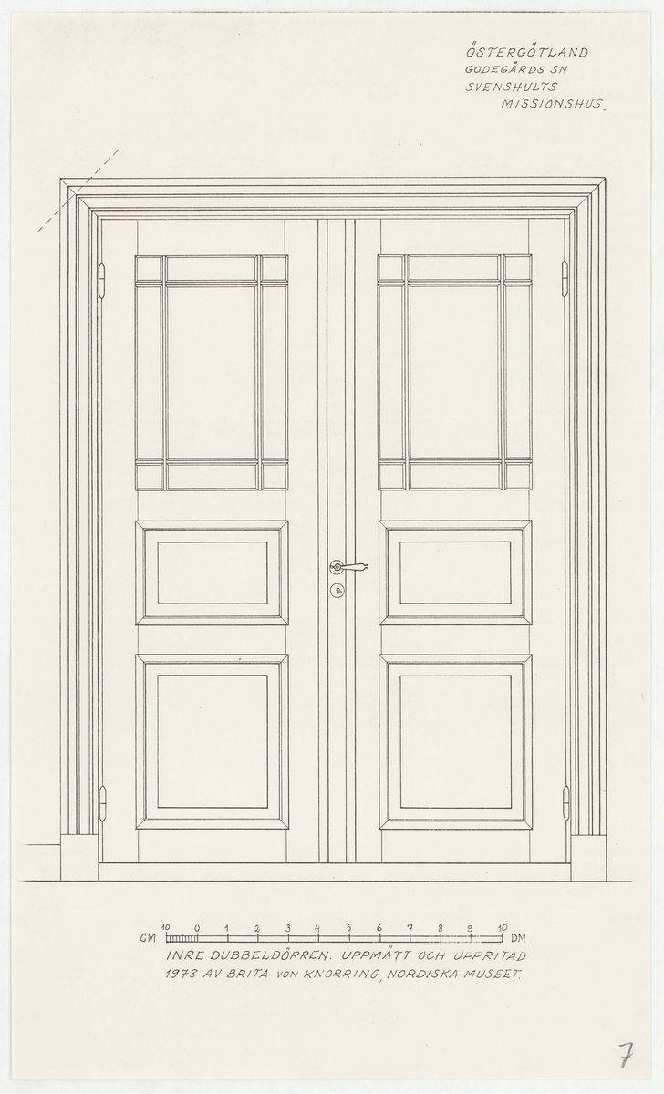 INRE DUBBELDÖRR UPPMÄTT OCH UPPRITAT 1978 AV BRITA VON KNORRING, NORDISKA MUSEET.