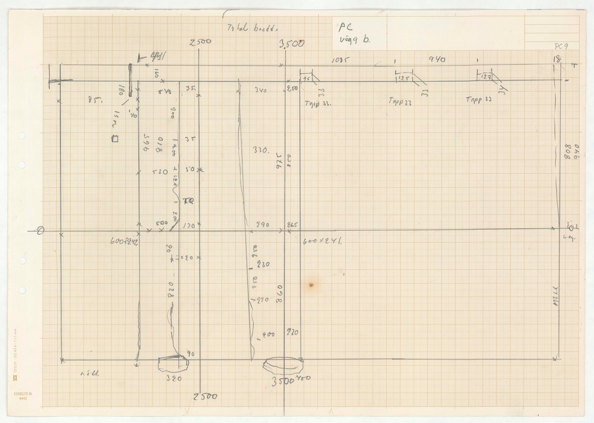 Titel: Skånegården. Bostadshuset. Detaljritning. PC vägg b.