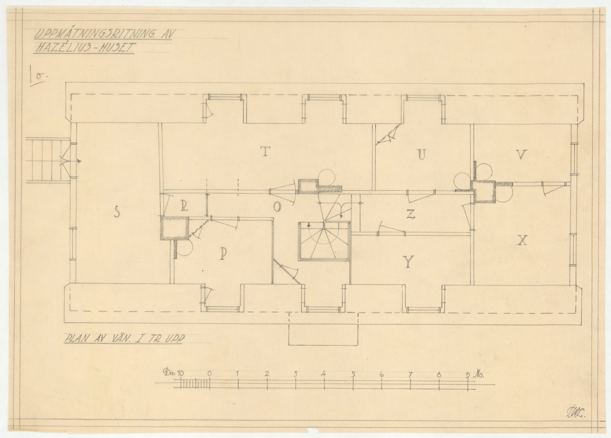 Titel: Hazeliushuset. Uppmätningsritning. Plan av våning 1 tr upp.