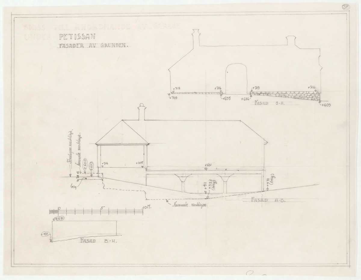 Titel: Apoteket/Petissan. Fasadritning. Petissan. Fasad av grunden.