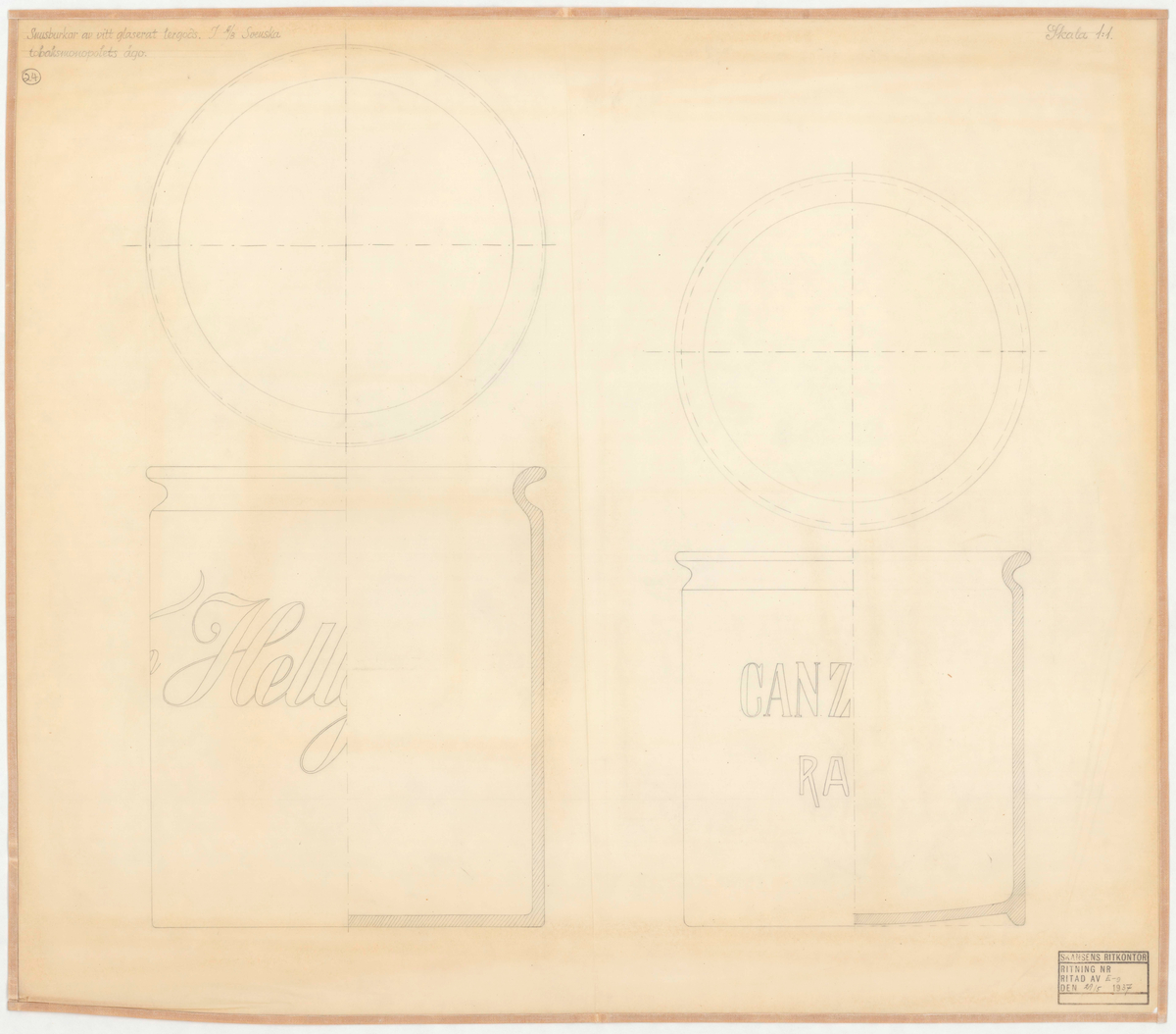 Titel: Kryddkramhandlarens hus. Profilritning. Snusburkar av vitt glaserat lergods.