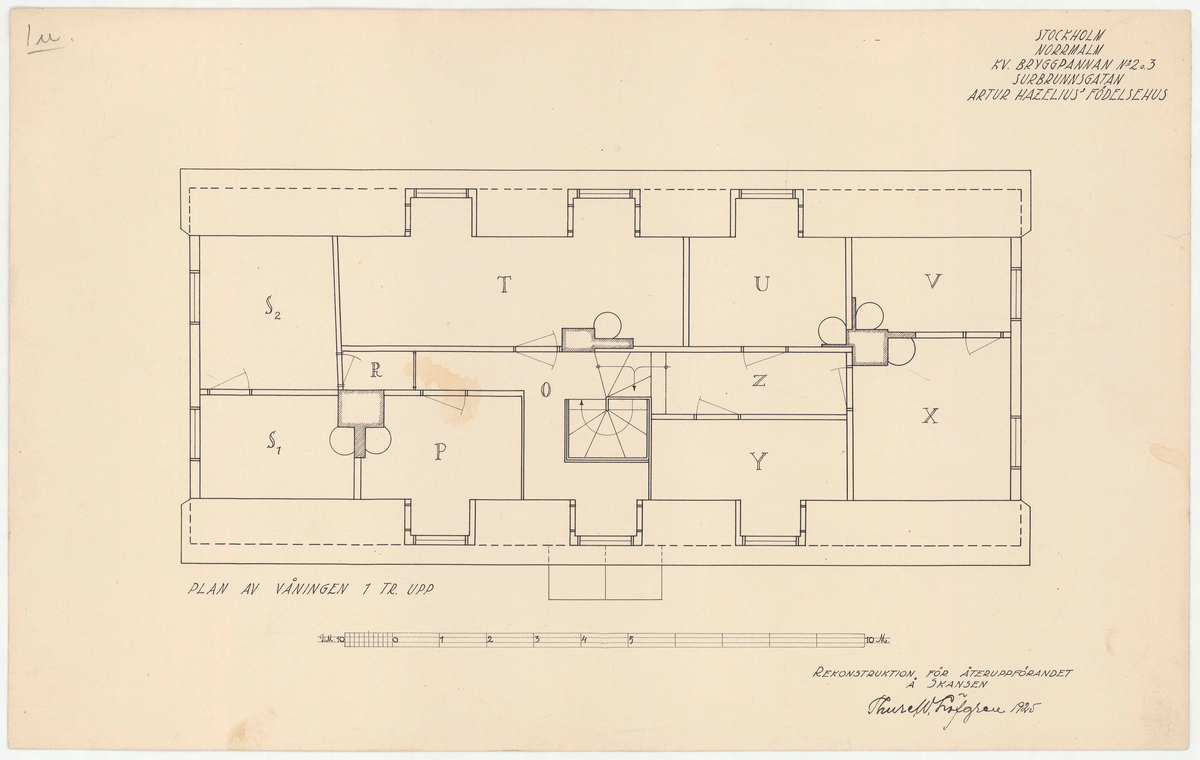 Titel: Hazeliushuset. Planritningen. Plan av våningen 1 tr upp.
