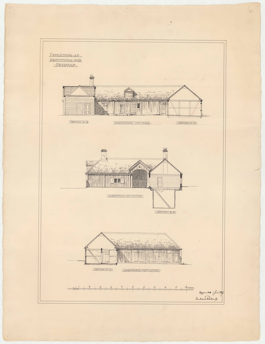 Titel: Apoteket/Petissan. Uppmätningsritning. Gårdsfasad mot norr. Gårdsfasad mot väster. Gårdsfasad mot öster.
