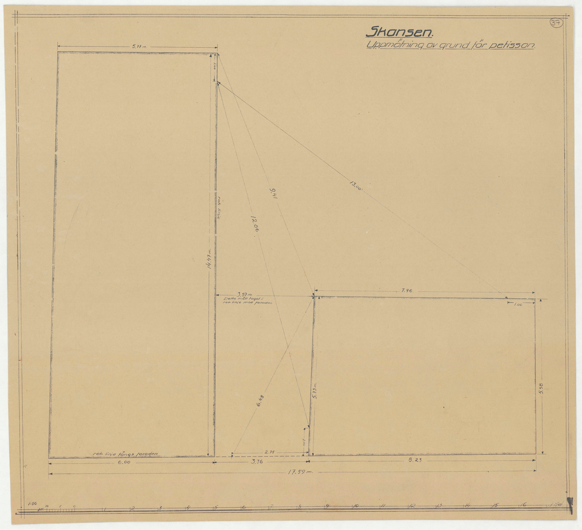 Titel: Apoteket/Petissan. Uppmätningsritning. Uppmätning av grund för Petissan.