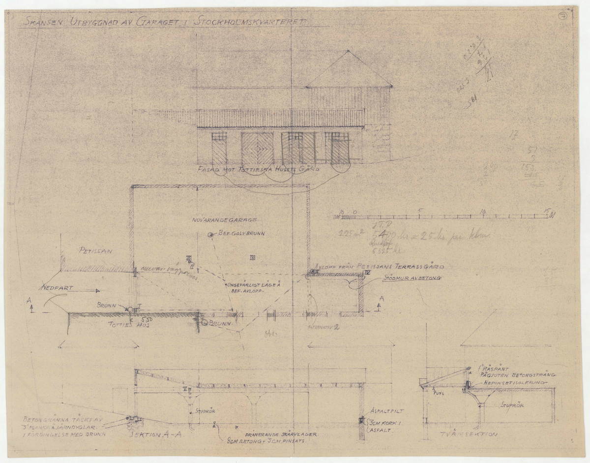 Titel: Apoteket/Petissan. Planritning. Fasadritning. Utbyggnad av garaget i Stockholmskvarteret.