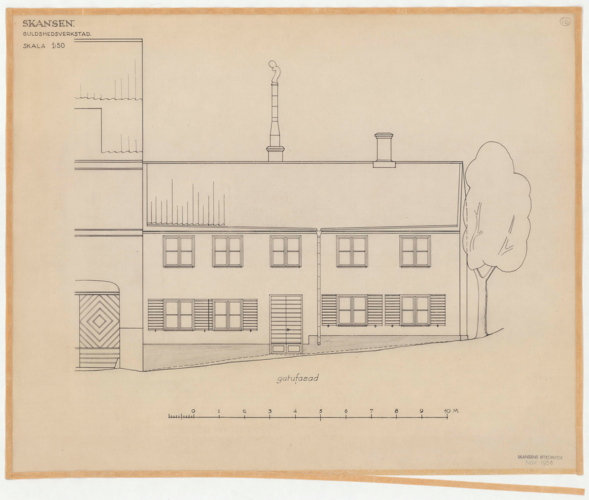 Titel: Guldsmedshuset. Fasadritning. Gatufasad.