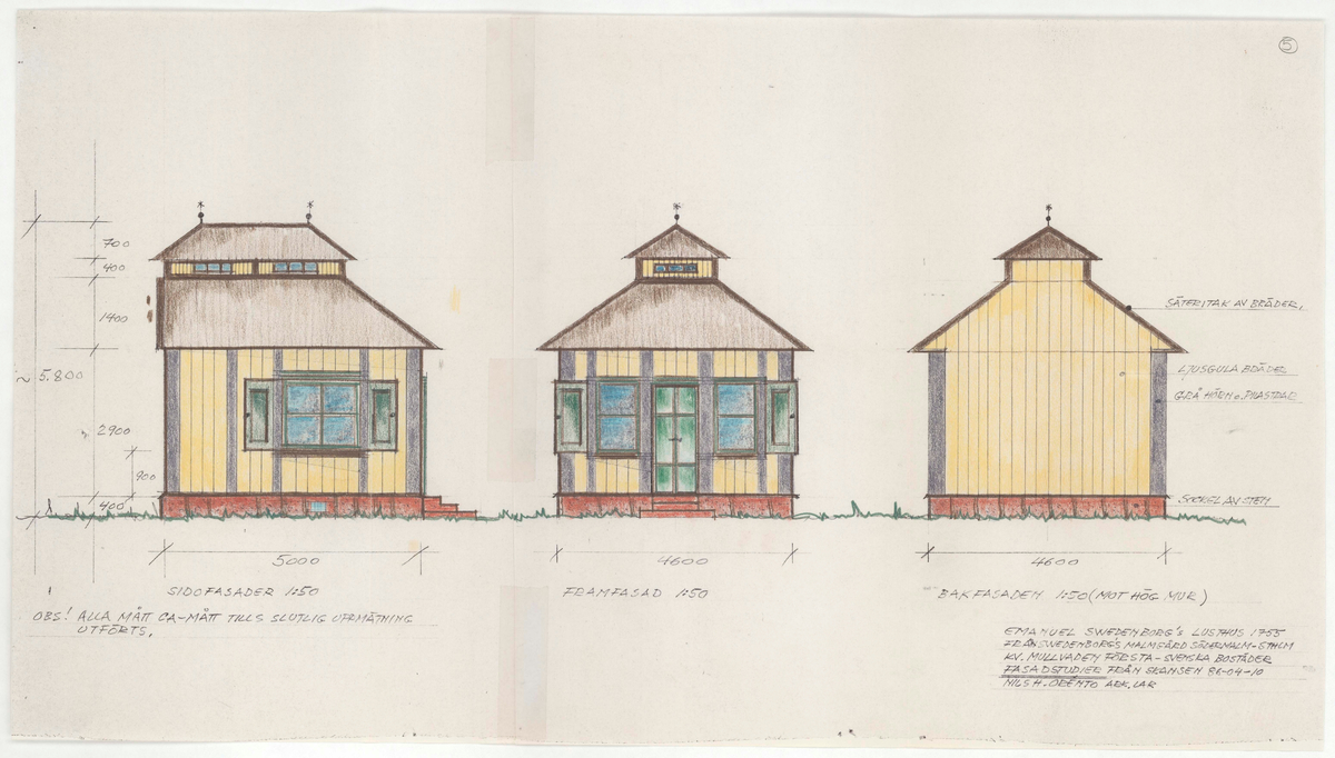 Titel: Swedenborgs lusthus. Fasadritning. Sidofasader. Framfasad. Bakfasad. Färglagd.