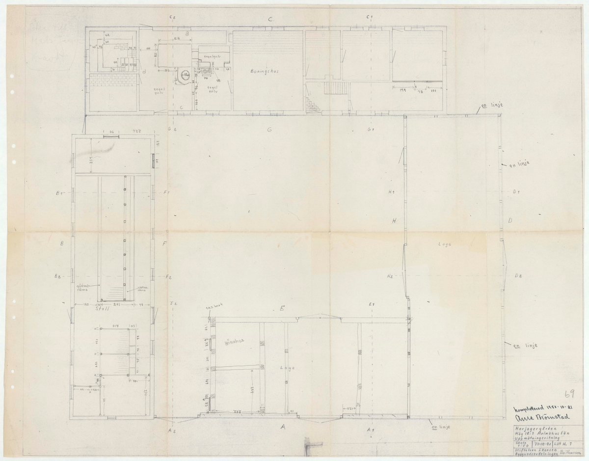 Titel: Skånegården. Planritning med mått för rum, dörrar och inredning i boningshus, stall och hönshus. Uppmätningsritning 1973-10-31 / Bo Kumerius. Kompletterad 1980-10-21 / Arne Biörnstad.