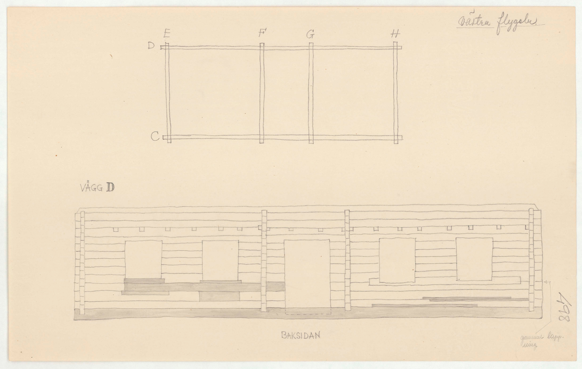 Titel: Skogaholms herrgård. Biblioteksflygeln. Detaljritning. Västra flygeln. VÄGG D.