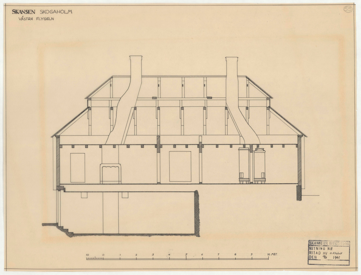 Titel: Skogaholms herrgård. Biblioteksflygeln. Sektionsritning.