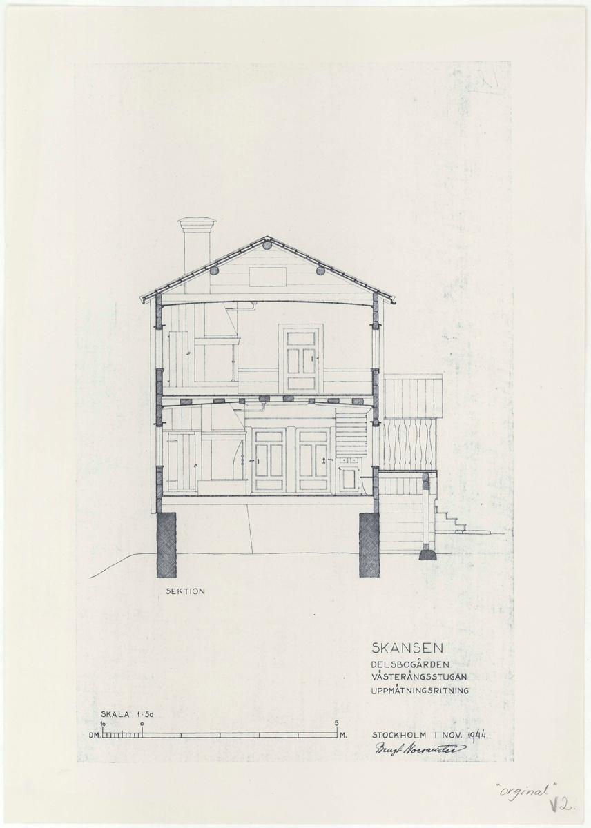 Titel: Delsbogården. Sektionsritning. Västerängsstugan. Uppmätningsritning.
