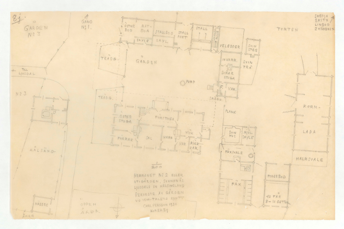 Titel: Delsbogården. Planritning. Rekonstruktion av gården vid 1800-talets slut.
