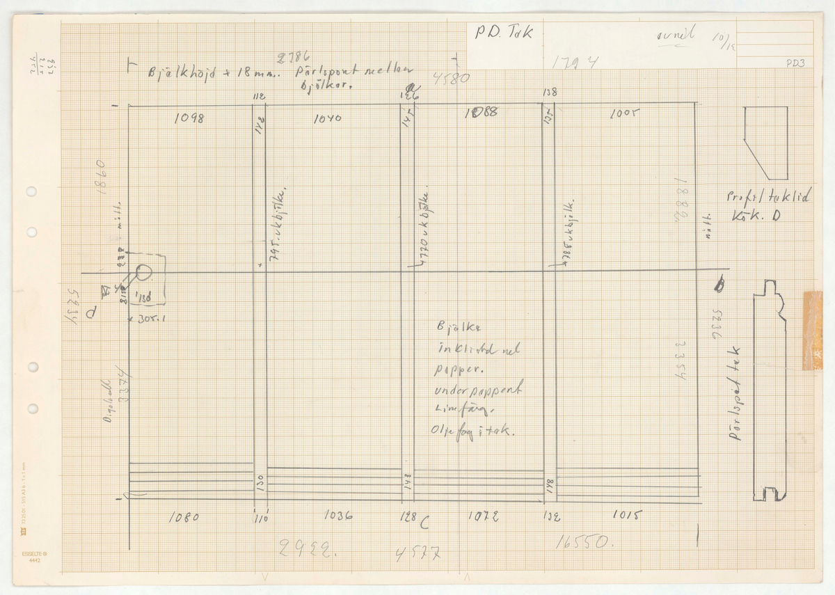 Titel: Skånegården. Bostadshuset. Detaljritning. PD tak. Mer text finns.