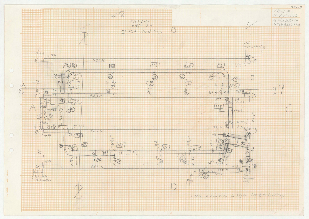 Titel: Skånegården. Bostadshuset. Detaljritning. HUS P. RUM H+J. KÄLLARE + GOLVBJÄLKAR Mer text finns.
