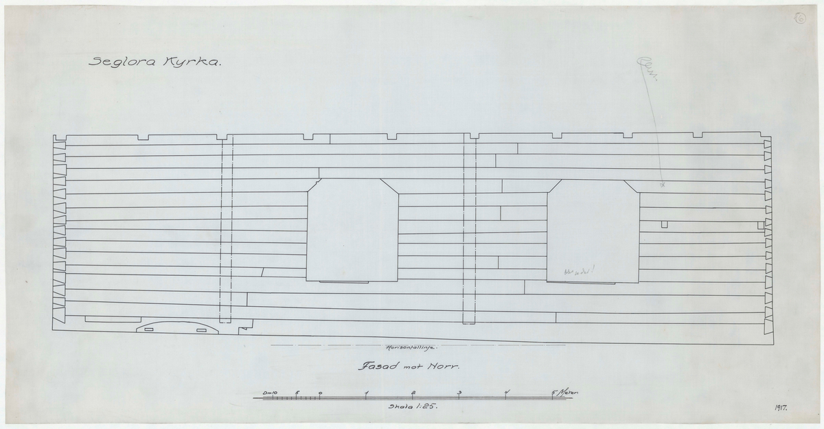 Titel: Seglora kyrka. Fasadritning. Fasad mot norr.