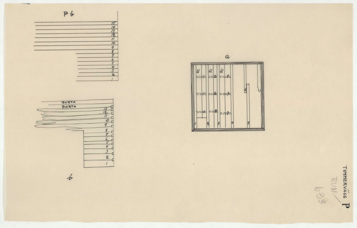 Titel: Skogaholms herrgård. Huvudbyggnaden. Detaljritning. TIMMERVÄGG P.