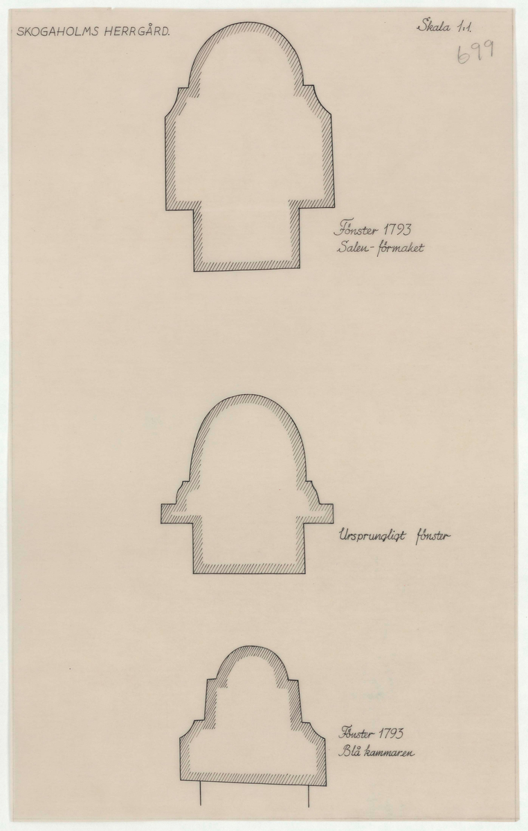 Titel: Skogaholms herrgård. Huvudbyggnaden. Detaljritning. Fönster 1793. Salen-förmaket. Ursprungligt fönster. Fönster 1793. Blå kammaren.