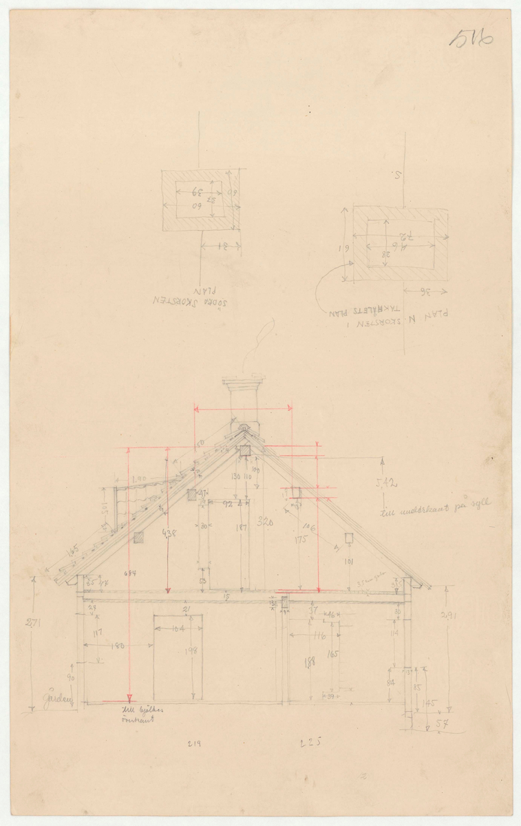 Titel: Skogaholms herrgård. Köksflygeln. Plan/sektionsritning. SÖDRA SKORSTENS PLAN. PLAN N SKORSTEN I TAKHÅLETS PLAN.