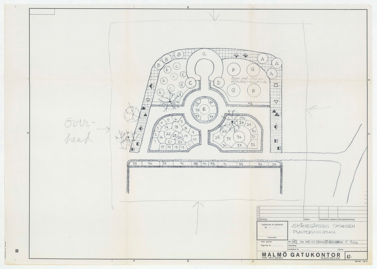 Titel: Skånegården Trädgården. Planteringsplan. Skala 1:100