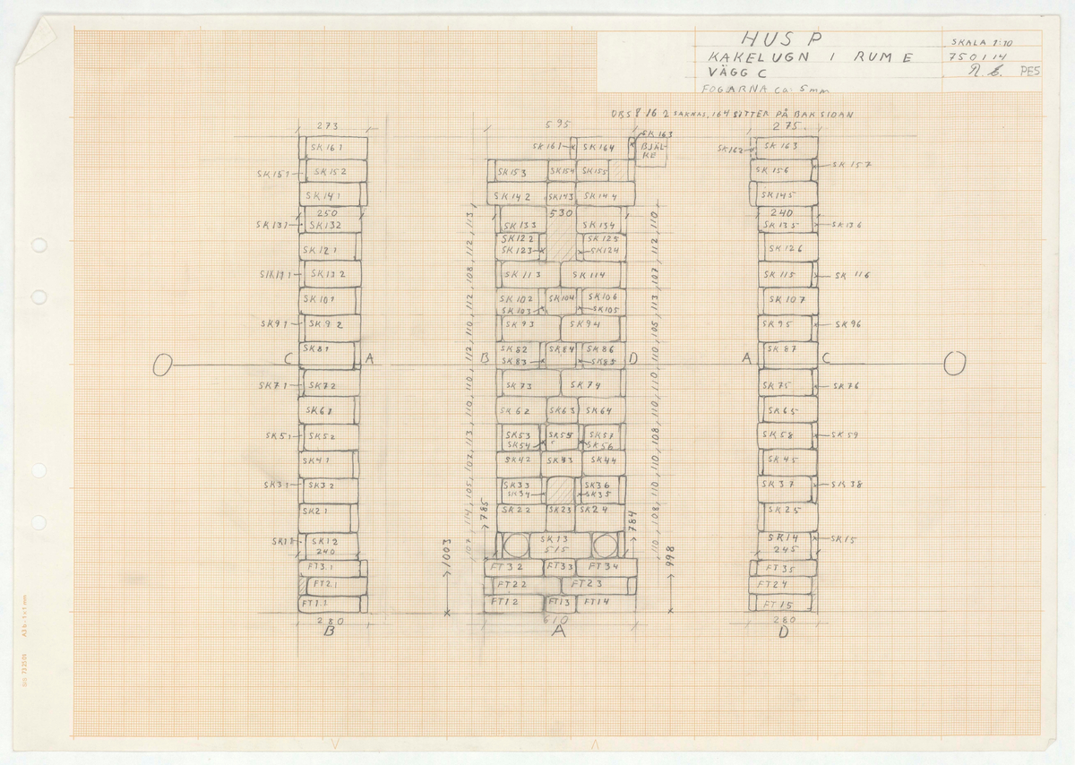 Titel: Skånegården. Bostadshuset. Detaljritning HUS P. KAKELUGN I RUM E. VÄGG C. Fogarna ca 5 mm