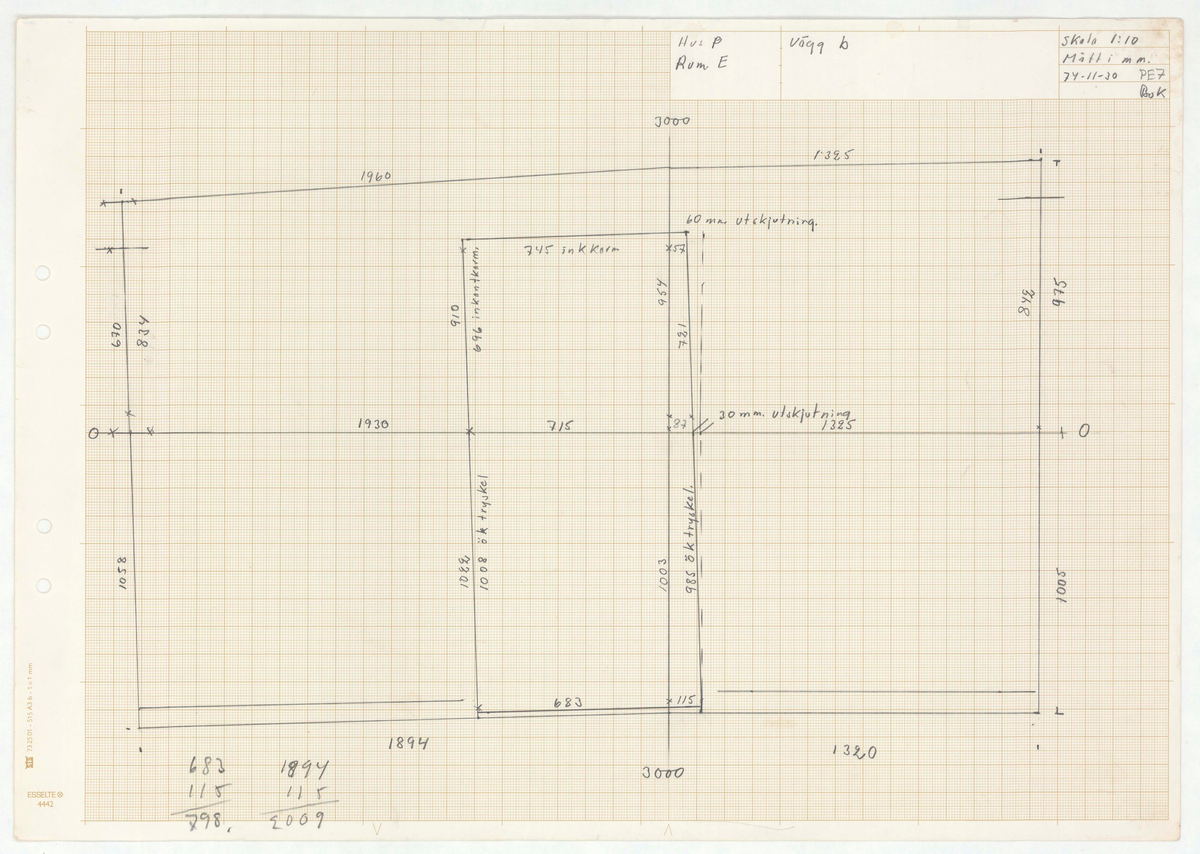 Titel: Skånegården. Bostadshuset. Detaljritning Hus P Rum E Vägg b. Mer text finns. Skala 1:10