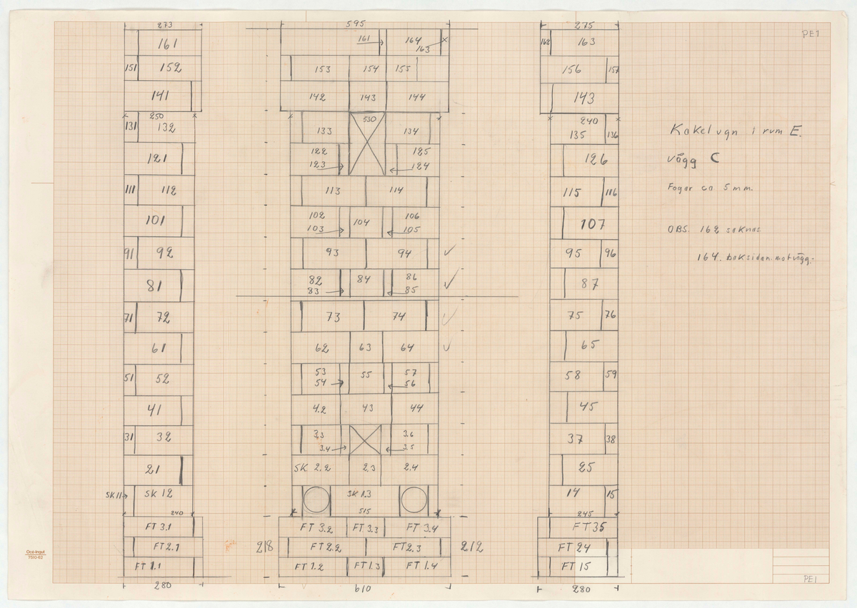 Titel: Skånegården. Bostadshuset. Detaljritning. Kakelugn i rum E. Vägg C. Fogar ca 5 mm.