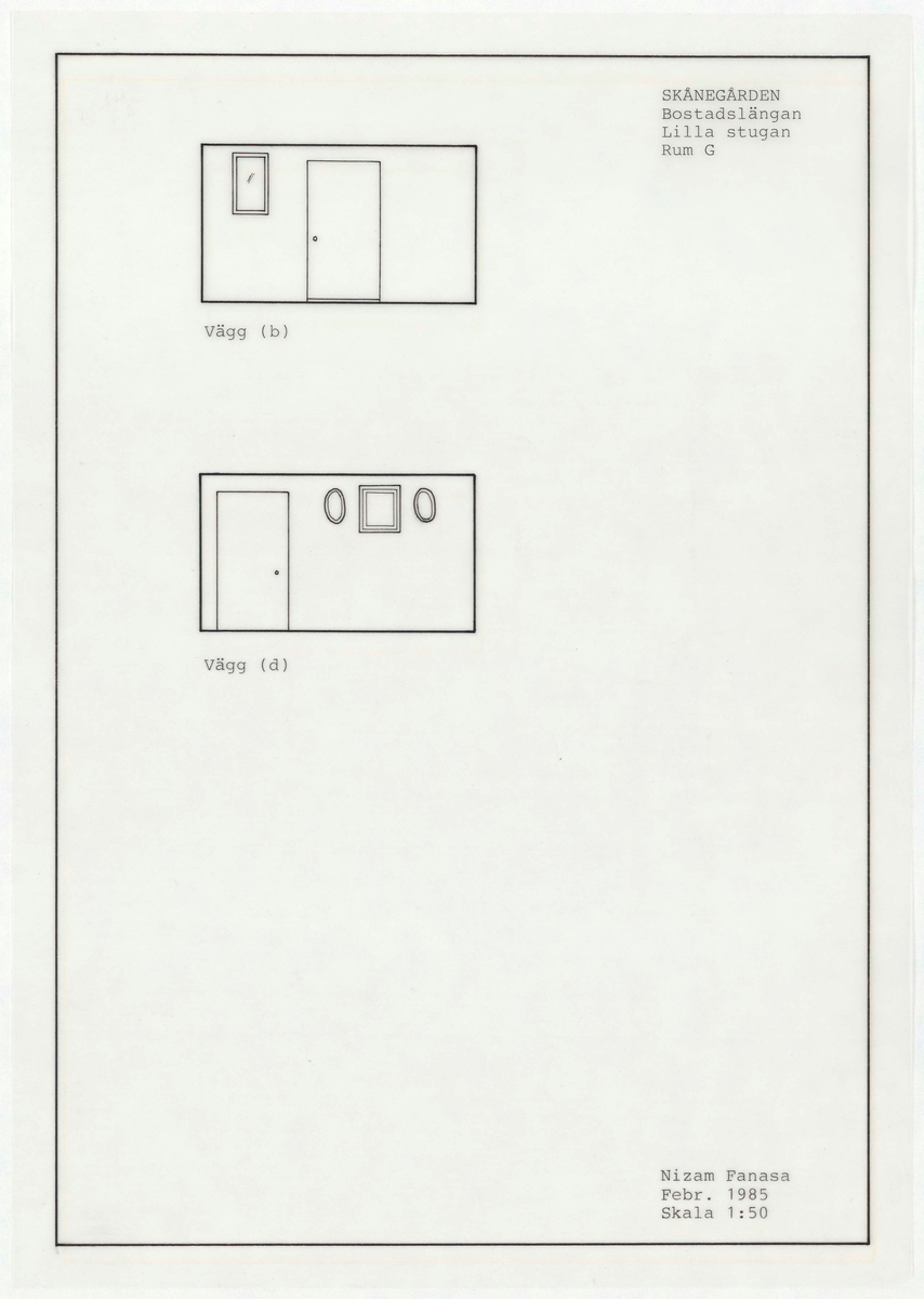 Titel: Skånegården. Bostadshuset. Detaljritning Lilla stugan Rum G. Vägg (b) Vägg (d) Skala 1:50