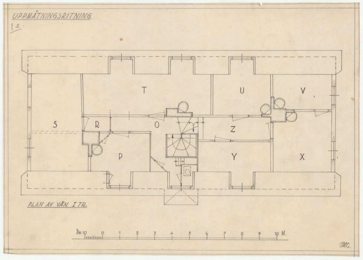 Titel: Hazeliushuset. Uppmätningsritning. Plan av våning 1 tr.