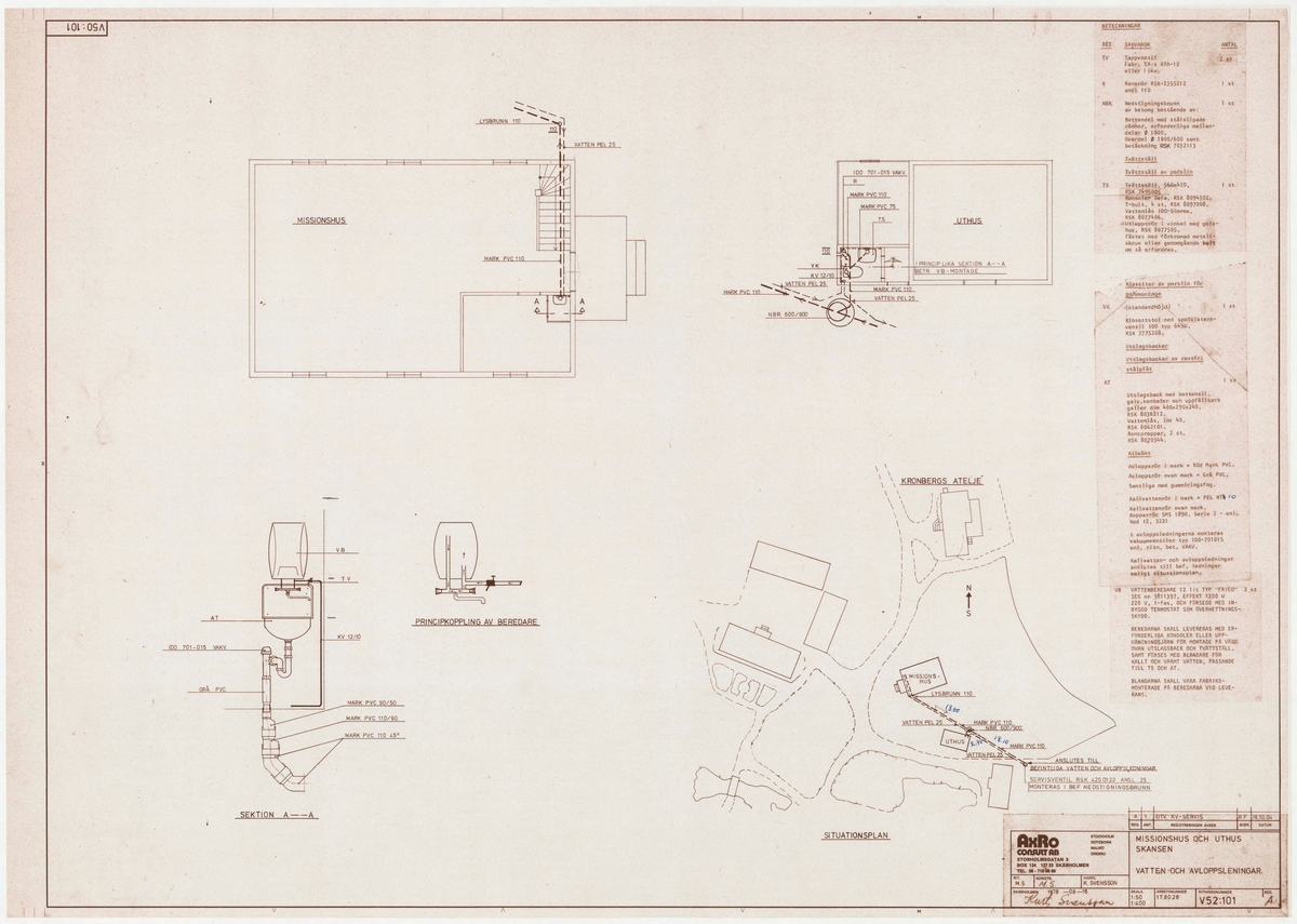 Titel: Missionshuset. Planritning. Situationsplan. Vatten- och avloppsledningar.