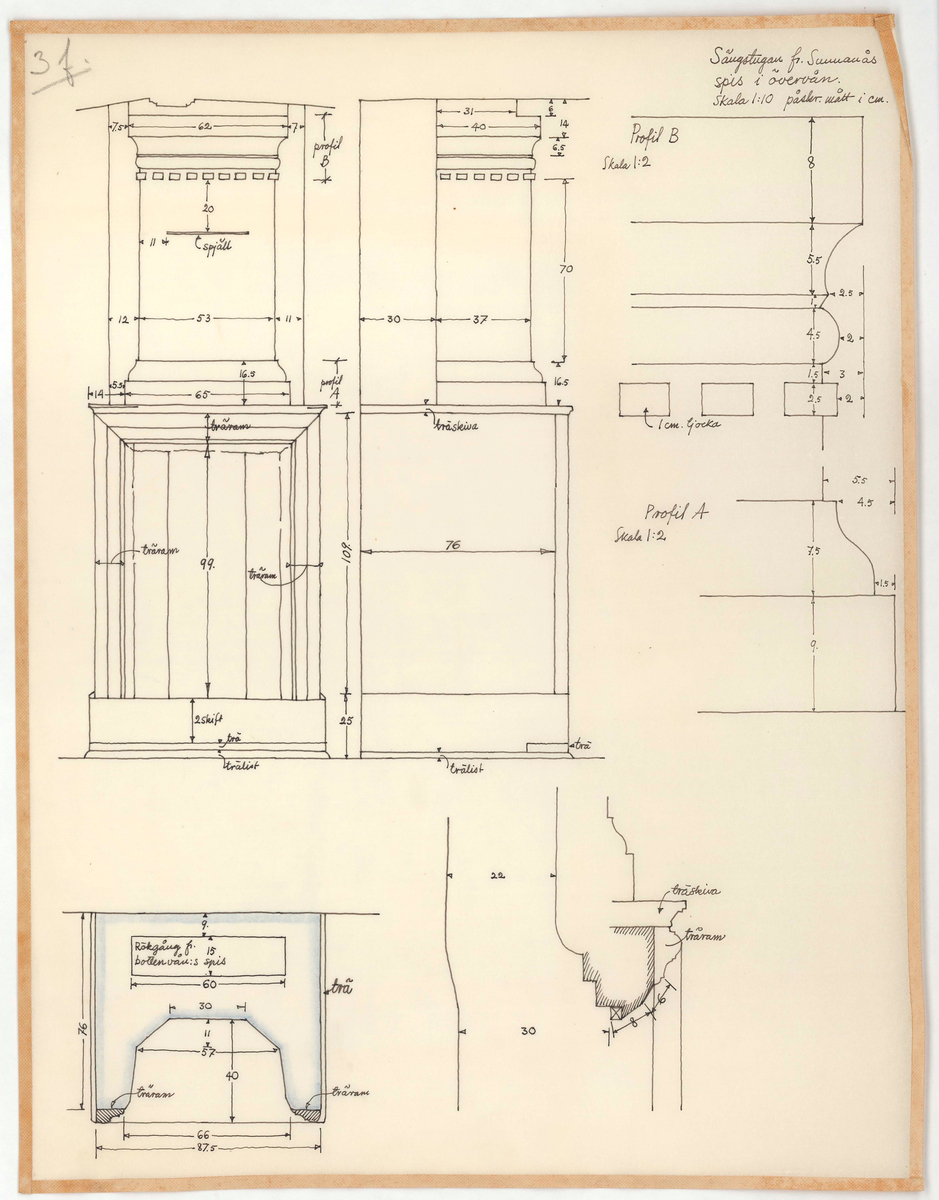Titel: Delsbogården. Uppmätningsritning. Sunnanåssängstugan. Spisen på övervåningen.