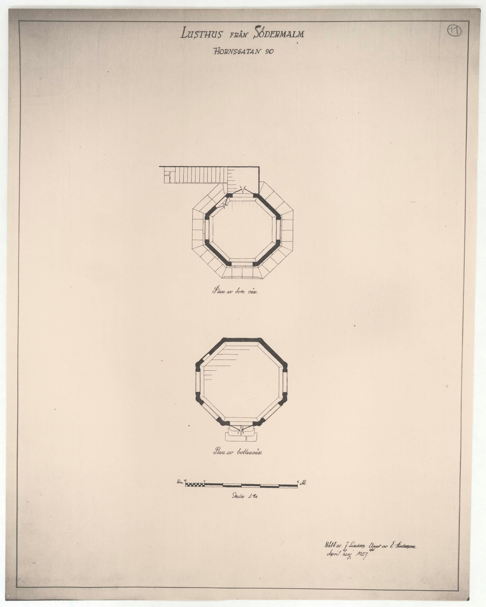 Titel: Spann målshandlarens lusthus. Planritning. Plan över bottenvåning. Plan över övre våning. Lusthus från Södermalm Hornsgatan 90