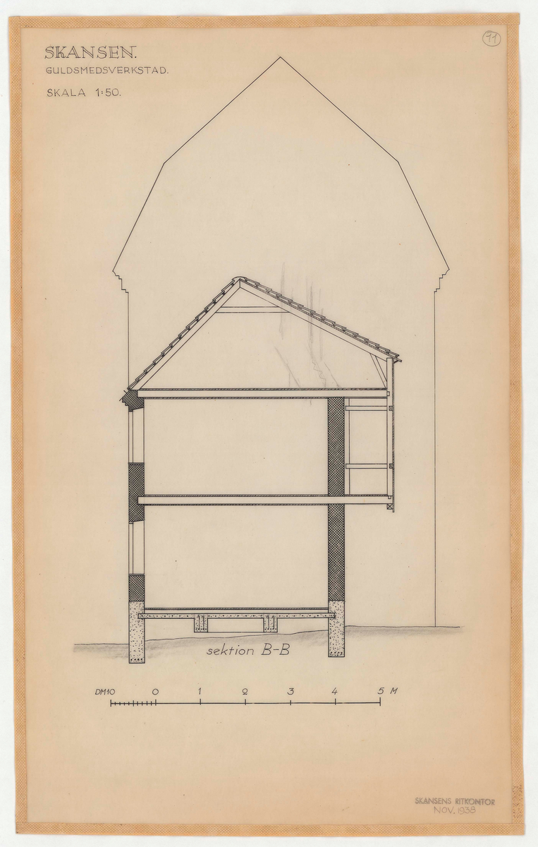 Titel: Guldsmedshuset. Uppmätningsritning. Sektion B-B.