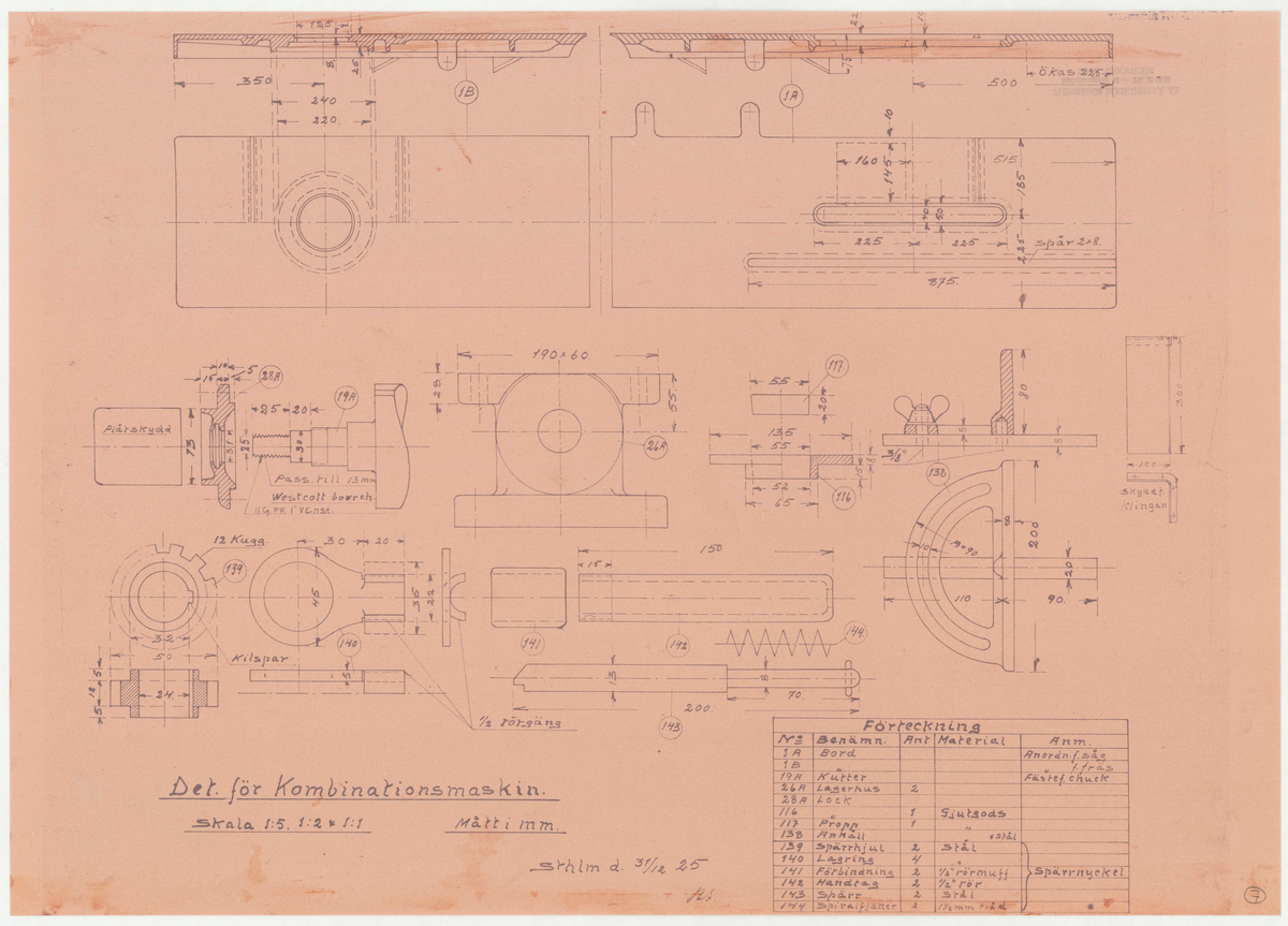 Titel: Snickerifabriken. Profilritning. Detaljer för Kombinationsmaskin.
