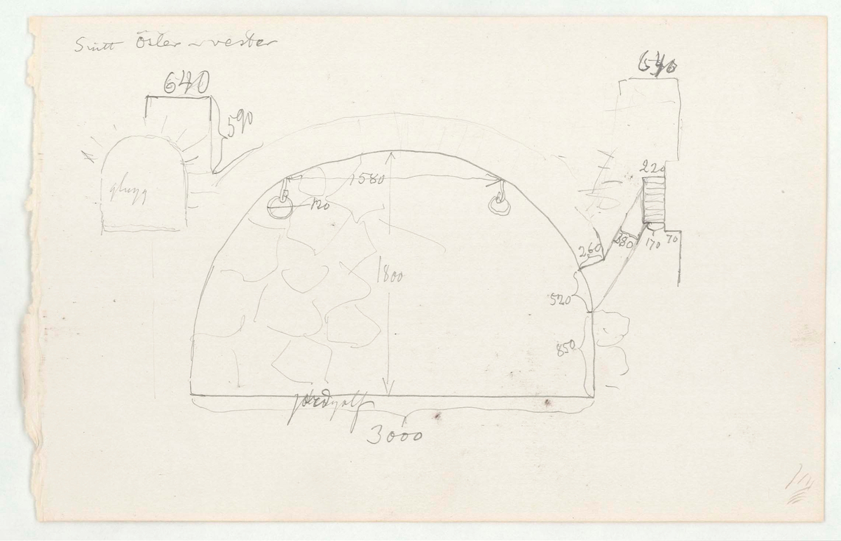 Titel: Skogaholms herrgård. Gunilla Bielkes lusthus. Västra paviljongen. Detaljritning. Snitt öster-väster.