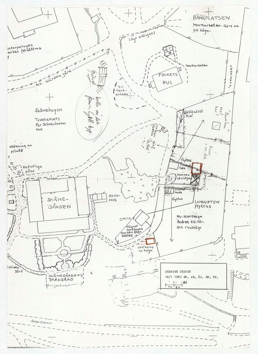 Reviderad kopia av situationsplan daterad 18/1 1983 tillsamman med initialer för ledningsgrupp m.fl. (Eva Nordenson, Arne Biörnstad, Mats Jansson, Pelle Palm, Åke Johnson + BN)
