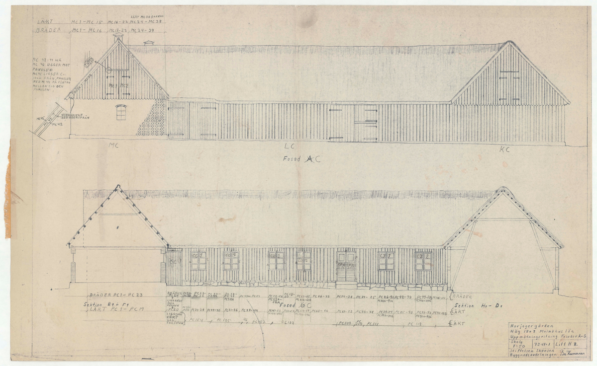 På Fasad C in mot gårdsplanen även Sektion B1-F1 och Sektion H1-D1.
