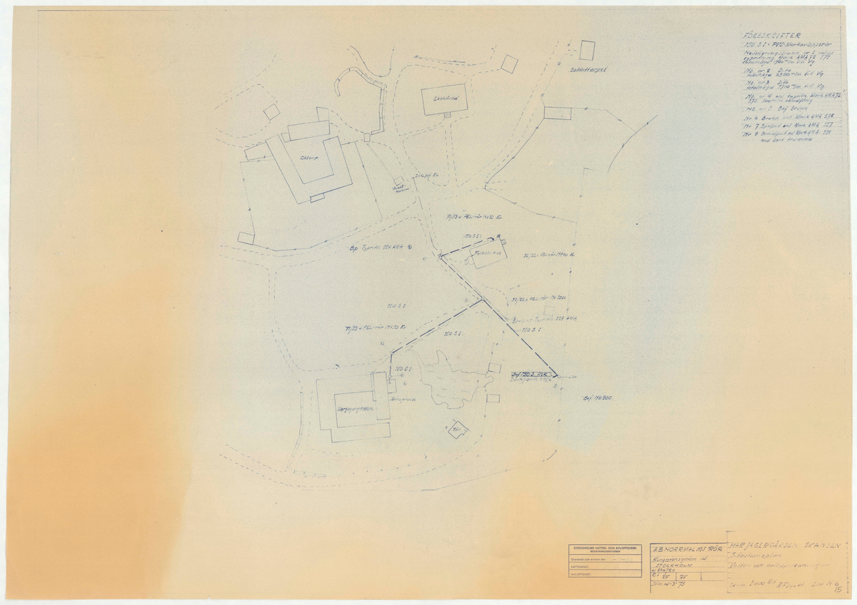 Titel: Skånegården på Skansen. Situationsplan med vatten och avlopp och relation till kringliggande bebyggelse.