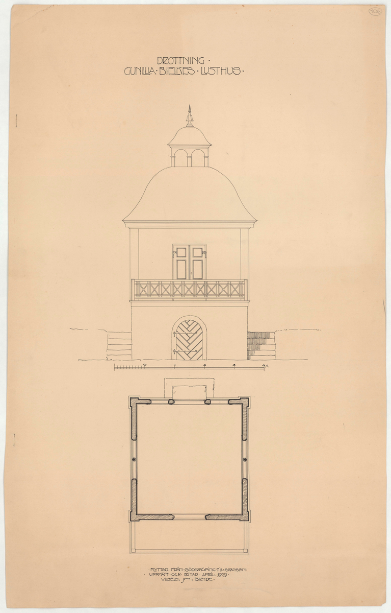 Titel: Skogaholms herrgård. Gunilla Bielkes lusthus. Västra paviljongen. Fasadritning. Planritning.