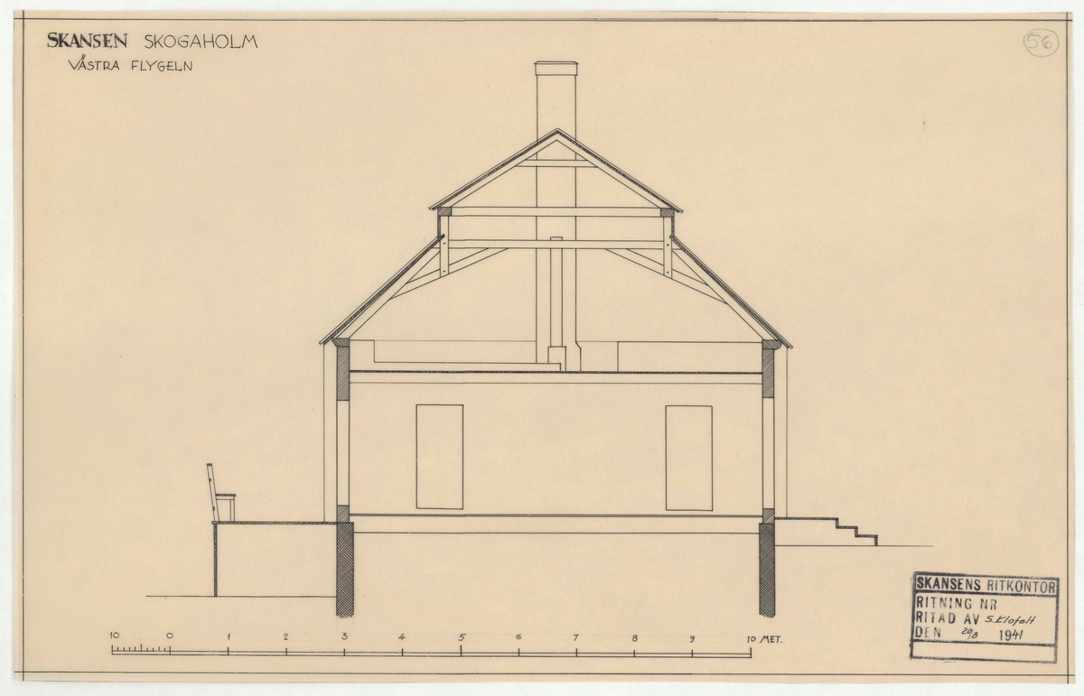 Titel: Skogaholms herrgård. Biblioteksflygeln. Sektionsritning. VÄSTRA FLYGELN.