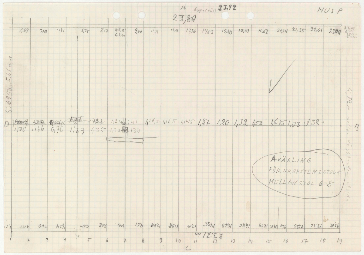 Titel: Skånegården. Bostadshuset. Ritning Växling för skorstensstock. Mellanstol 6-8.