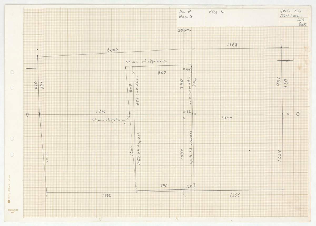 Titel: Skånegården. Bostadshuset. Detaljritning. Hus P. Rum G. Vägg a. Skala 1:10